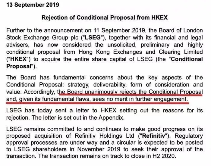After being rejected by the London stock exchange, hkex replied that its board continued to view the proposed merger with the London stock exchange group as a significant strategic opportunity for mutual benefit and win-win results and to create a leading global financial market infrastructure. Hkex believes lse shareholders should have the opportunity to analyse both deals in detail and will continue to approach them.